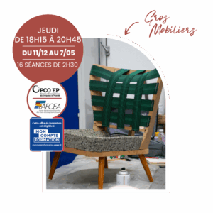 Vous serez accompagné à chaque étape du garnissage de votre mobilier par un enseignant des élèves CAP tapisserie, qui est également artisan d’art en activité. Votre formateur, récemment référent d’une élève ‘Meilleure Apprentie de France’ (MAF), vous transmettra avec passion le savoir-faire de la tapisserie dans une approche à la fois ludique et professionnelle.